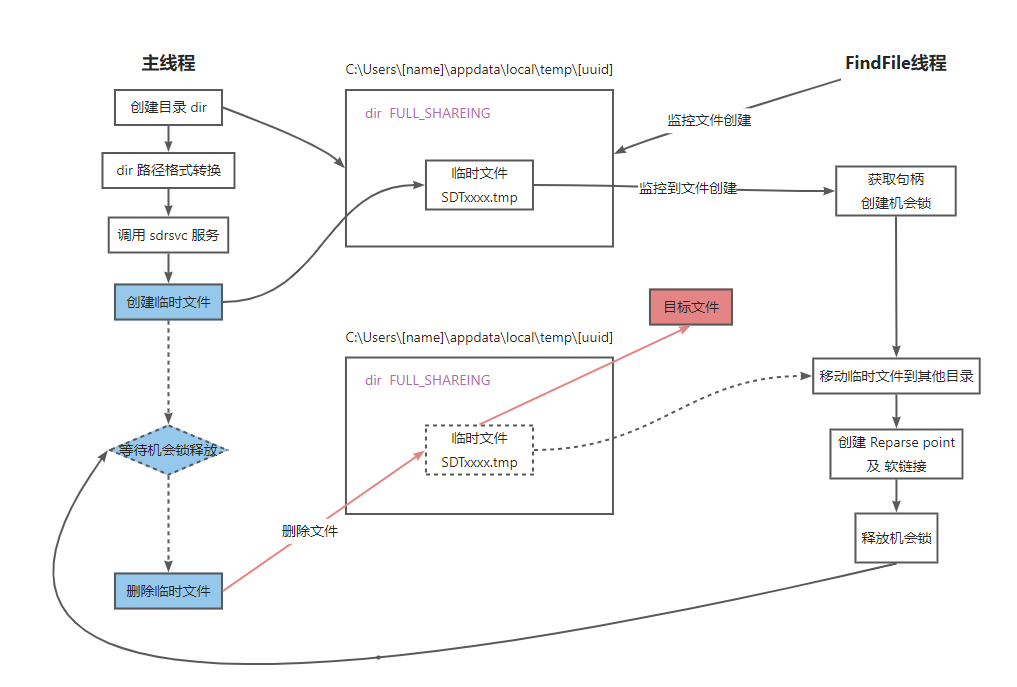 上面补丁对比的结果可以确定这是一个条件竞争漏洞,由于临时文件的创建操作和删除操作接次发生,并且在两个操作之间没有对文件进行限制,这就导致攻击者可以创建另一线程,在临时文件创建之后,删除之前,获取文件句柄并创建机会锁阻止其他线程操作,同时将文件删除,并设置原文件路径指向其他文件,当机会锁释放后,指向的其他文件就会被删除。