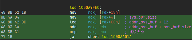 修复前的代码在检查了stackLocation->Parameters.Read.Length 是否小于 8 之后,也检查了 [sys_buf]+12 是否大于 [sys_buf] + sys_buf.size ,就是说根据 size 字段计算得到的 sys_buf 的末尾地址是否超过了 sys_buf 后 12 个字节的地址,只有在超过的情况下才会访问它的 PowerupReason字段 。看起来好像没问题,这不就是在检查 sys_buf 的大小有没有超过 12 个字节吗?然后我才意识到,这里获得的 sys_buf 的大小并不是来源于函数 IoBuildDeviceIoControlRequest 中的 InputBufferSize 参数,即通过 sizeof (STORAGE_IDLE_POWERUP_REASON) 得到的大小,而是来自参数 PowerupReason 中的 size 字段,这个字段是用户可控的!