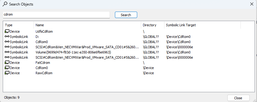 在 WinObj64.exe 中搜索 cdrom,找到一下内容: